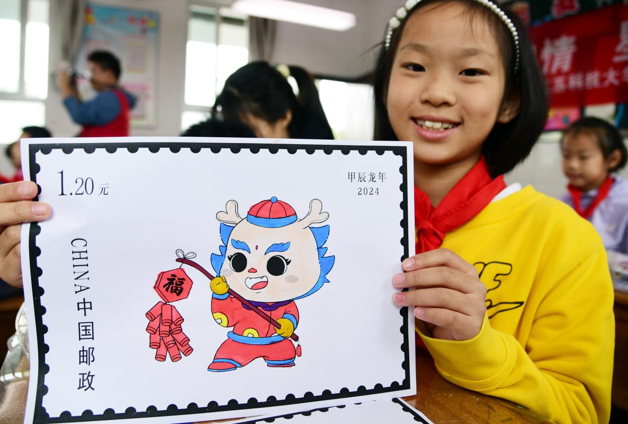 圖為小朋友展示自己繪制的郵票 石玉成 攝